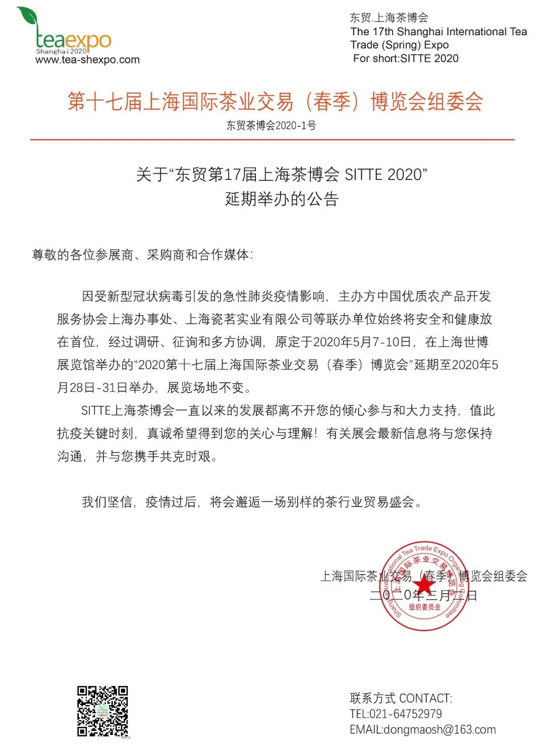 根據(jù)上海春季茶博會(huì)設(shè)計(jì)搭建公司領(lǐng)藝展覽了解到,因受新型冠狀病毒肺炎疫情的影響,原定于2020年5月7-10日,在上海世博展覽館舉辦的“2020第十七屆上海國際茶業(yè)交易(春季)博覽會(huì)”延期至2020年5月28-31日舉辦,展覽場(chǎng)地不變。如需上海茶博會(huì)設(shè)計(jì)請(qǐng)聯(lián)系領(lǐng)藝展覽,希望我們能在上海茶博會(huì)搭建上為您添磚加瓦,祝各位朋友收獲多多,滿載而歸!